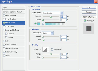 Klik ganda pada layer glow untuk membuka layer style. Conteng check list pada Outer glow, dan atur nilainya seperti pada gambar di bawah ini.